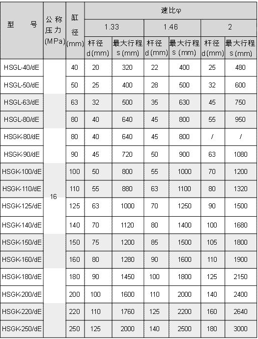 HSG系列工程液壓缸基本參數,包括缸徑、桿徑、最大行程。