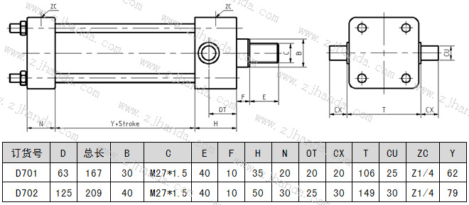 前銷軸安裝的低壓拉桿液壓缸的尺寸圖及參數(shù)