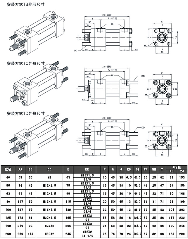 以下為YGD標準液壓缸TB\TC\TD四拉桿液壓缸具體參數,客戶可按照以下圖表來選型。